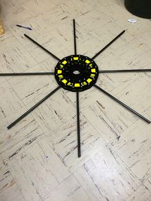The main frame of the octocopter was laser cut in the Mechanical Engineering Department Mechatronics Lab. A view of the laser cut is seen in Figure 'Laser Cutter'. Acrylic Plastic was recommended for the frame because it’s durable and low cost. The main frame had 3D printed rod slots which were sandwiched between two identical acrylic cuts. Figure '3D Printed Parts' and Figure 'Assembling the Frame' demonstrate the sandwiched carbon fiber rod.